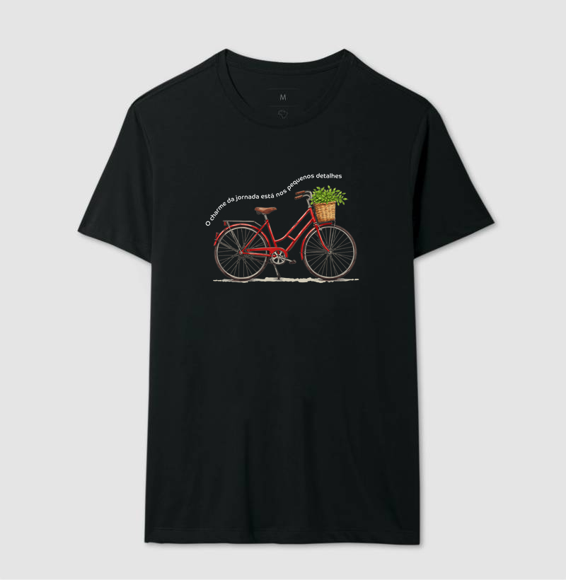 Uma estampa encantadora que combina o charme retrô de uma bicicleta vermelha com uma cesta cheia de folhas verdes, pintada em um estilo artístico com traços texturizados. Complementando o visual nostálgico, a frase "O charme da jornada está nos pequenos detalhes" adiciona um toque reflexivo e inspirador, tornando esta peça perfeita para os amantes da simplicidade e beleza do cotidiano. Camiseta fabricada com algodão premium, conforto e estilo garantidos.